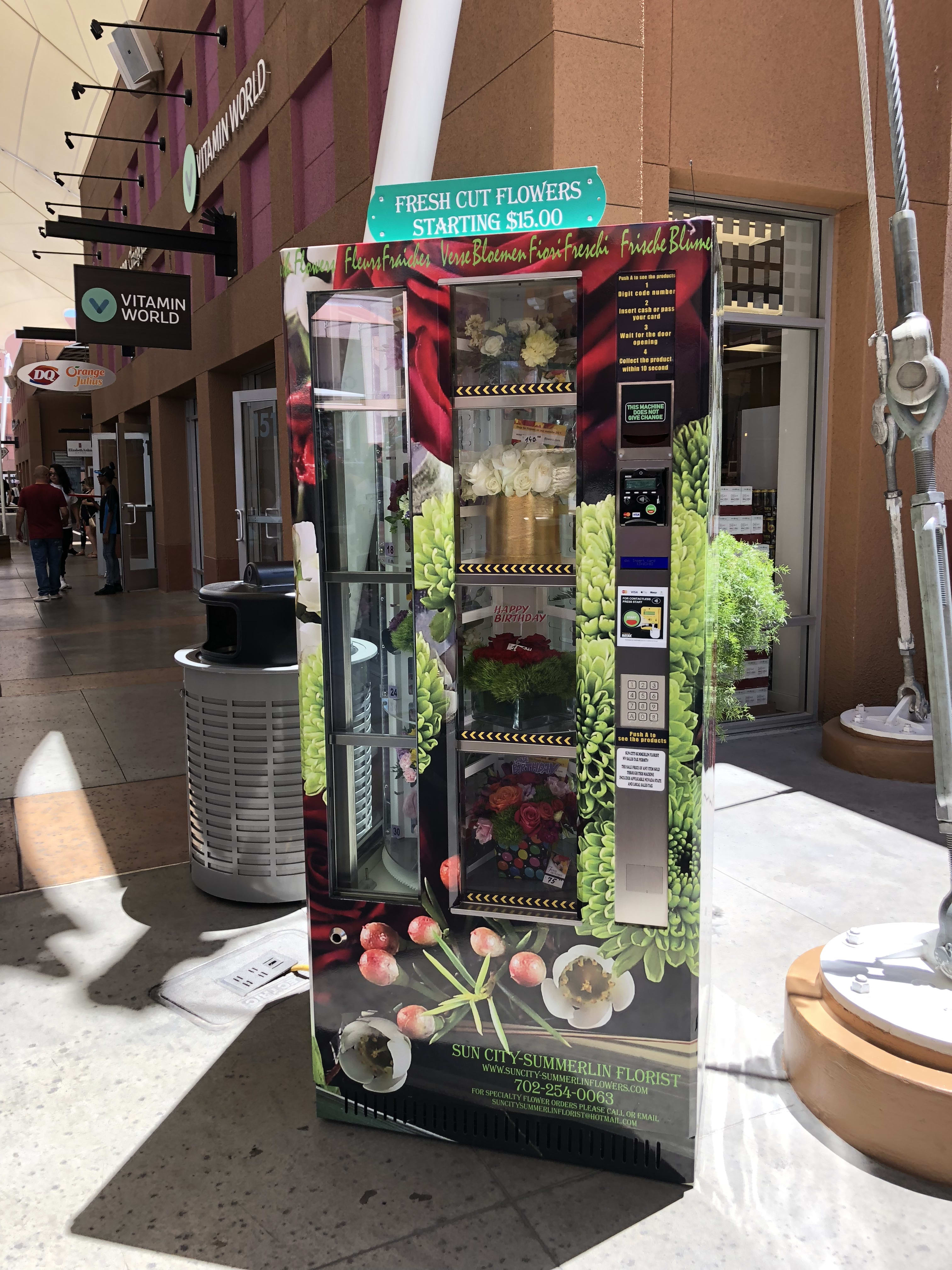 Sun City Summerlin Florist offers the first carry out flower vending machine located in a commercial center in Las Vegas. Need flowers right now? If you need fresh flowers or plants at any given time through out the day; please visit our flowers vending machine located in North Premium Outlets Las Vegas. Select the desired floral arrangement, pay and pick it up right now. Please give us a call for more information at 702-254-0063.